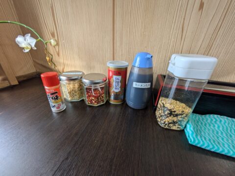 カウンターに並ぶのは、一味、フライドガーリック、乾燥唐辛子、拉麺胡椒。そして……「のりたまふりかけ」。 「机上に基本調味料が多い店は良い店」というのが私の持論ですが、ふりかけまで置かれているところに、「市場で働く人々を寄り添い支えたい。」の心意気を感じます。